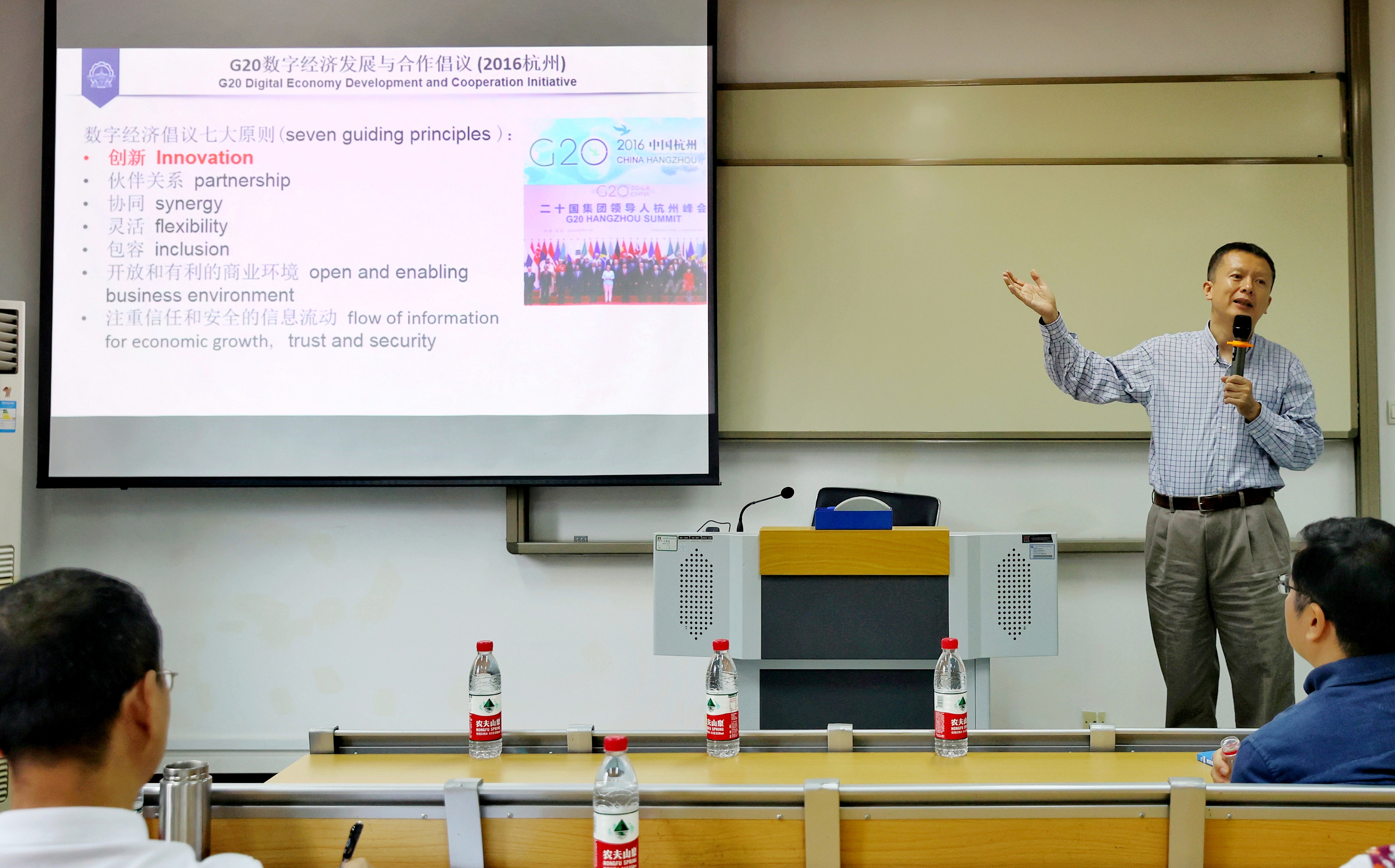 叶强教授在讲座中详细论述第四次产业革命以及数字经济发展对商学院带来的机遇和挑战,并结合哈工大海棠书屋