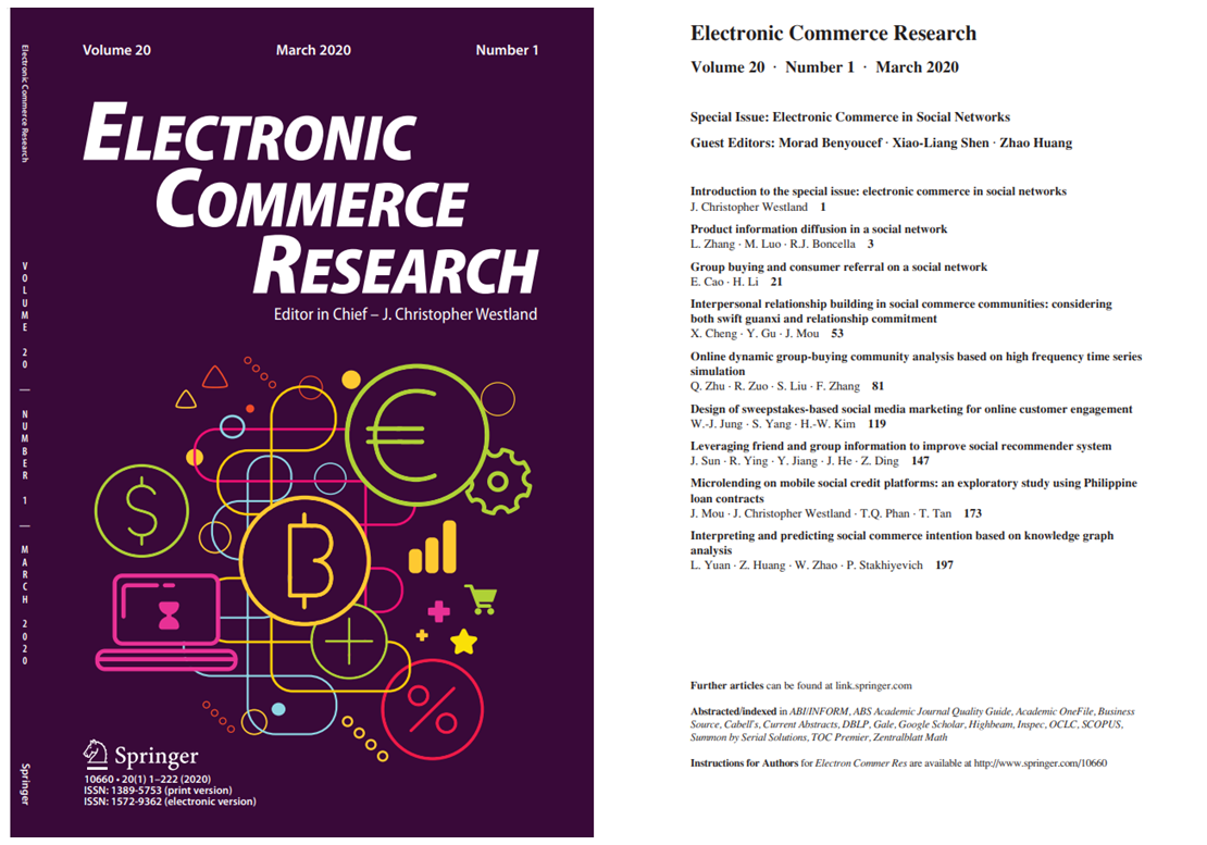 沈校亮教授担任客座主编的SSCI期刊《Electronic Commerce Research》特辑(Special Issue)“Electronic Commerce in Social Networks”于2020年3月在该期刊第20卷第1期正式出版。
