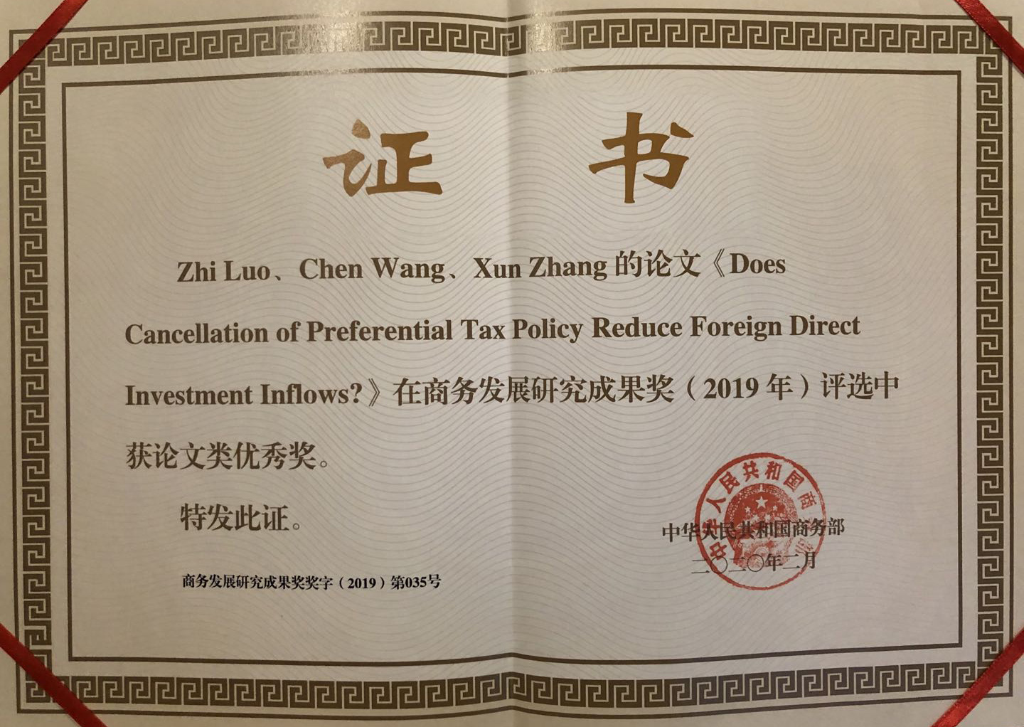 罗知教授以第一作者身份发表在China & World Economy(vol.26, No.6, 2018)上的论文Does Cancellation of Preferential Tax Policy Reduce Foreign Direct Investment Inflows获得商务发展研究成果奖(2019)优秀奖。商务部1999年开始设立全国商务发展研究成果奖,每两年评选一次。该奖项面向全国的社会科学类奖项,用于奖励商务领域具有前瞻性、创见性,有较高理论和学术价值的著作、论文和研究报告,以及对政府决策和实际工作产生重要影响的研究成果。
