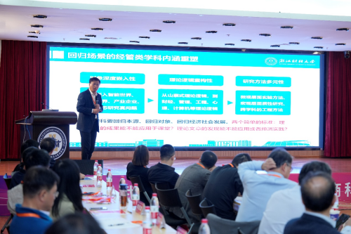 最后,魏江教授提出,经管类学科必须与时俱进、大有作为、承担责任,加快构建中国特色的哲学社会科学自主知识体系,形成中国特色的学术体系、学科体系和话语体系,努力在百年未有之大变局下,讲好中国故事、发出中国声音。