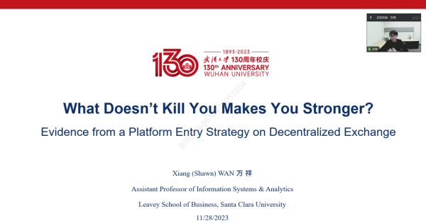 技术经济及创新管理系于11月28日上午举办技术经济及创新管理学术论坛第9期,特邀美国圣克拉拉大学万祥老师举办学术讲座,讲座主题为“What Doesn’t Kill You Makes You Stronger? Evidence from a Platform Entry Strategy on Decentralized Exchange”。论坛由范如国教授主持。