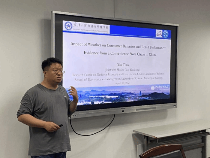 4月19日,珞珈经管创新论坛第93期在学院举行。本次讲座邀请了中国科学院大学田歆教授进行题为“Impact of Weather on Consumer Behavior and Retail Performance: Evidence from a Convenience Store Chain in China”的学术报告。论坛由管理科学与工程系陈植元老师主持,许明辉、陆菊春、柯剑男、李彬等老师及众多硕士、博士研究生参与本次讲座。