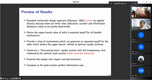 5月26日下午,经济学高级研究论坛第185期在线举行。本次讲座由数理经济与数理金融系韩立宁老师主持,邀请中山大学徐欣毅老师带来主题为“Optimal royalty auction with bidder heterogeneity and seller moral hazard”的学术报告。海棠书屋