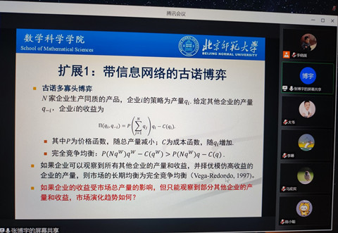 “动态博弈与学习理论”青年学术团队承办的经济学高级研究论坛第190期在腾讯会议平台以线上方式举行。论坛邀请北京师范大学数学科学学院张博宇教授做题为“网络上的演化博弈动态”的学术报告。论坛由海棠书屋