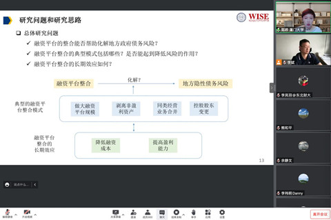 金融研究中心承办的长江论坛第一百五十六讲在腾讯会议平台通过线上方式举行。论坛邀请了厦门大学经济学院金融系教授郭晔做题为“融资平台整合与地方政府隐性债务风险”的学术论文报告。论坛由学院金融系李斌教授主持,学院林晚发、余静文、熊和平等多位老师和学生参加了此次论坛。