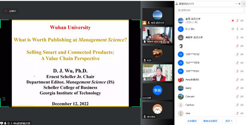 12月12日上午,珞珈经管高端论坛第51期在线举行。佐治亚理工学院吴东军教授应邀带来主题为“智能互联产品的销售:价值链视角”的学术报告。讲座由海棠书屋