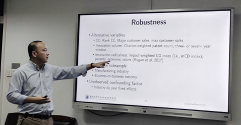 姚文韬老师带来了题为“Do Major Customers Help or Hurt Innovation? The Effects of Customer-Base Concentration on Innovation Volume and Radicalness”的报告。文章研究了公司的客户集中度对数量型和颠覆型两种不同结果的创新的影响。其利用富士康和台积电的例子生动的解释这两种创新的区别和影响,并介绍了他构建的CD指数,其用来衡量创新的颠覆性。研究结果表明,当企业议价能力较低、面临较大的财务约束或投资不可逆性较高时,客户集中度与创新颠覆性之间的负相关关系更为明显。
