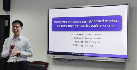 杨世杰老师带来了题为“Managerial reaction to analysts’limited attention: Evidence from overlapping conference calls“的学术报告。文章使用了一组时间重合的电话会议,即同一位分析师所研究的公司同时出现多个电话会议,来检验分析师对公司自愿披露选择的有限关注。研究发现,在时间重合的电话会议期间,分析师的参与率较低。文章进一步证明,公司管理人员可以通过增加披露的数量和质量来弥补分析师注意力稀缺的问题,同时增加时间重合的电话会议的信息披露可以减轻这些负面的影响。
