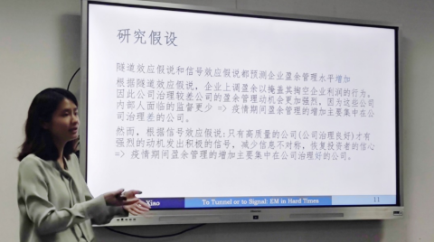 沈思晨老师的报告题为“To Tunnel or to Signal: Earnings Management in Hard Times”。 在新冠病毒大流行的背景下,文章研究了企业如何通过盈余管理应对负面冲击。文章提出隧道效应和信号效应两种假设。研究发现,新冠疫情后,企业的盈余管理水平显著增加,这种盈余管理的增加集中在公司治理良好的公司,伴随着更正面的市场反应。与利用盈余管理来弥补隧道成本的低质量公司不同,高质量公司在市场不景气时通过上调盈余来恢复投资者的信心,告诉投资者该公司有快速复苏的能力。此外,研究探究了疫情对公司财务决策的影响,强调了操纵盈余的信号效应,为盈余管理的决定因素提供了新证据。