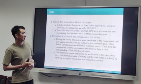 周彤老师展示了其研究“Industrial Robots and Finance”。文章从实证和理论两方面研究了工业机器人的使用对企业融资的影响。在理论上,作为劳动力的替代品,机器人可以对冲劳动力成本的波动。此外,文章还使用了中国不同省份和行业的机器人使用的企业层面数据,发现机器人的使用可以平滑现金流和降低破产风险,其降低了债务成本,增加了杠杆率。这种关系在劳动力贡献较高的企业中更强,因为机器人劳动力可替代性更高,机器人调整成本更低。