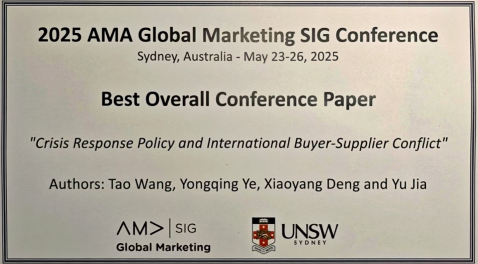 汪涛教授和博士生叶咏清、邓潇扬(*通讯作者)等合作论文《Crisis-Driven Regulatory Interventions and Buyer-Supplier Conflict in Global Supply Chains: Evidence from COVID-19 Lockdowns》,被2025 AMA Global Marketing SIG Conference(Sydney, Australia)接收,并在会议上宣讲。该论文凭借其创新性理论视角和严谨的实证分析,从众多优秀论文中脱颖而出,荣获“最佳会议论文奖”(Best Overall Conference Paper),成为本届会议唯一获此殊荣的研究成果。