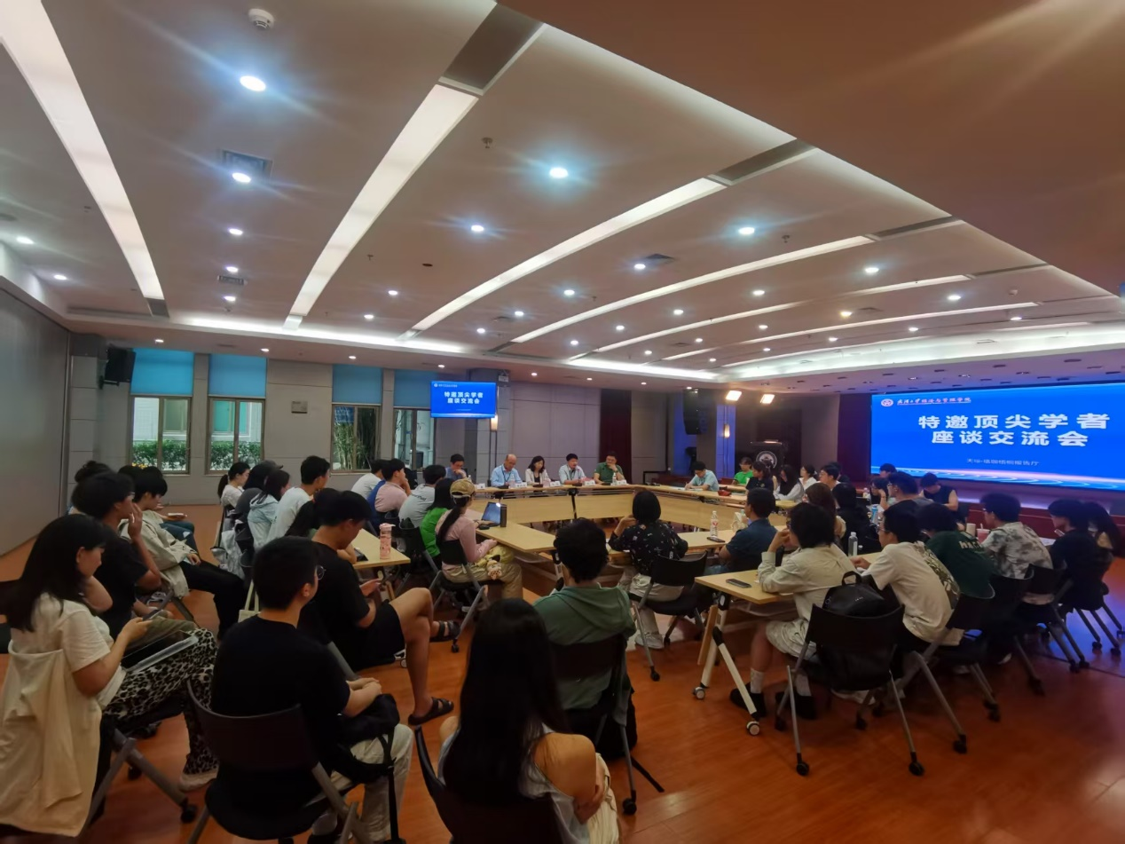 之后,会议进入自由交流环节。当教科书和文献里的学术名家亲临现场、与同学们面对面时,大家倍感振奋,争相举手提问。交流内容广泛而务实,既聚焦学术发展,又关切申请实务细节,还深入探讨了生涯规划。现场互动频频,掌声阵阵,也引发同学们对学术追求与人生价值的思考。