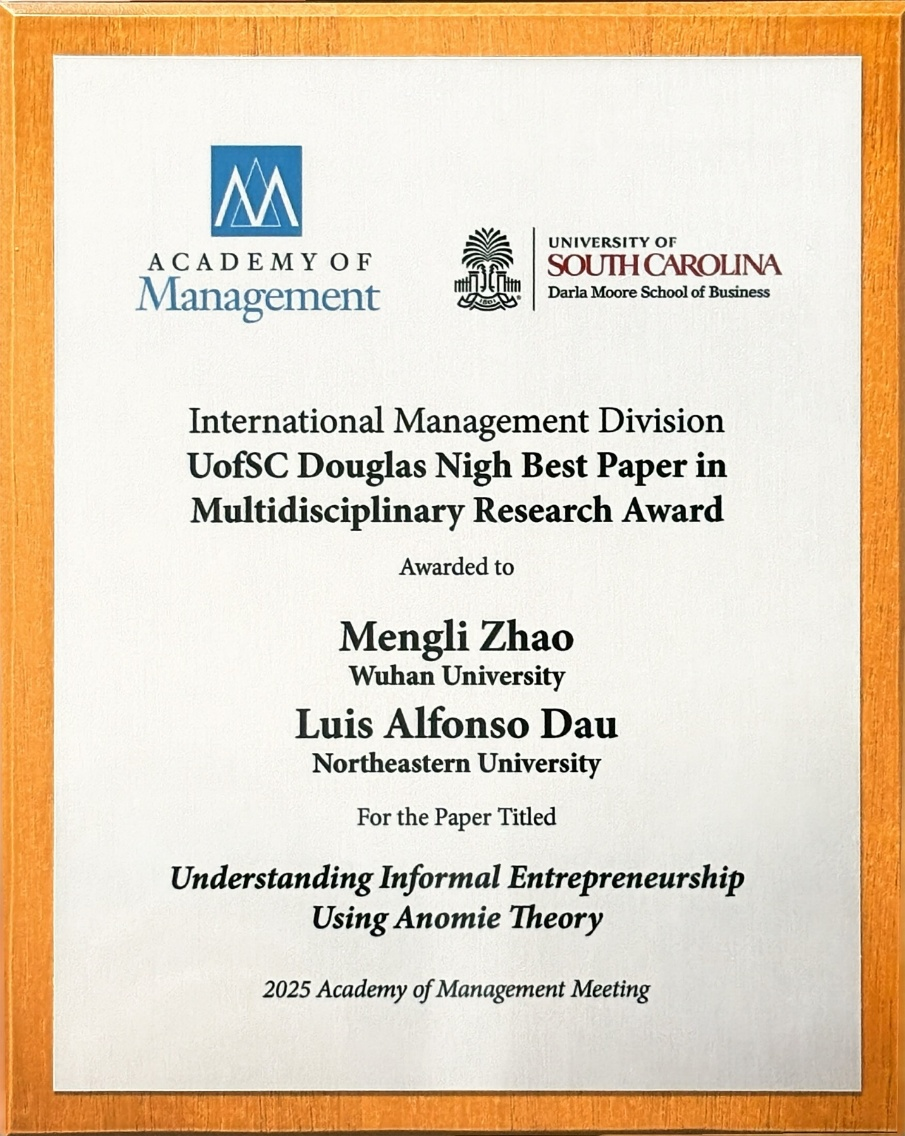 赵孟丽副研究员与美国东北大学 Luis Alfonso Dau 教授合作的研究论文《Understanding Informal Entrepreneurship Using Anomie Theory》,荣获国际管理分会(IM Division)“UofSC-Douglas Nigh Best Paper in Multidisciplinary Research Award”。这是IM分会专为跨学科研究设立的最高荣誉奖项,每年仅颁发一篇。