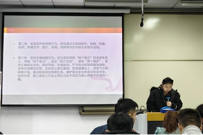 应用经济学硕士第二支部纪检委员岳晓松领学了《共产党员网络行为管理规定》,强调了党员实施网络行为,要坚持正确政治方向、舆论导向、价值取向,严守政治纪律和政治规矩,发挥先锋模范作用,走好网上群众路线。