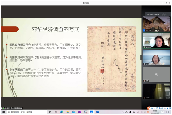 复旦大学历史系副教授皇甫秋实随后分享了关于《危机中的美国总统特使:1944年纳尔逊使团对华经济调查》的学术研究。她运用了丰富的史料如美国罗斯福总统图书馆的资料、国内的二档资料以及台湾国史馆的资料,通过对比美国和国内的资料,恢复了关于纳尔逊使团对华经济调查的完整图景,同时对纳尔逊使团的调查方式、调查内容以及影响进行了系统性的考察。复旦大学教授李楠对其研究进行了总结并针对数据挖掘等方面提出了建议。