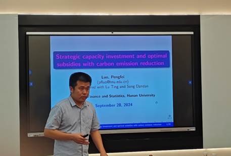 罗鹏飞老师带来题为“Strategic capacity investment and optimal subsidies with carbon emission reduction”的报告。罗老师以社会环境关注度和碳减排为切入点,在一个连续时间框架的双寡头动态模型中阐述社会环境关注度和竞争博弈对政府最优补贴、企业碳减排策略、产能投资决策的影响。模型结果指出社会环境问题会导致政府最优补贴和产能水平下降,还会对碳减排产生U型效应。同时不确定性提高了补贴、后来企业投资后的碳减排量和产能水平。