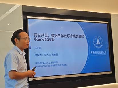 孙宪明老师带来题为“同甘共苦:数据合作社可持续发展的收益分配策略”的报告。孙老师指出国内数据资源及数据交易存在“有效供给不足、数据价值外溢效应不明显、多主体数据协同难度大”等问题,并利用理论建模方法构造出一个数据合作社发展的策略。孙老师认为数据合作社应根据其所处阶段来合理选择收益分配方案,在发展初期应采用平均分配模式来缓解成员顾虑,在发展中后期再按照成员边际贡献来分配收益。