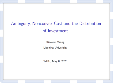 5月8日下午,珞珈经管青年论坛第四百八十二期——数理经济与数理金融论坛在学院举行。论坛邀请了辽宁大学王小雯老师进行题为Ambiguity, Nonconvex Cost and the Distribution of Investment(模糊性,非凸成本与投资分布)的学术报告。学院多位教师、博士研究生参会。