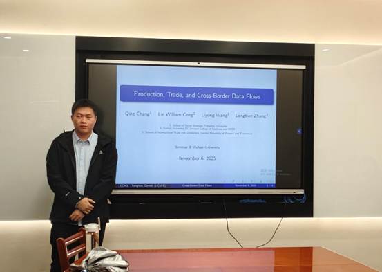11月6日下午,由学院金融系主办的景林珞珈金融论坛第269期在学院237(金融系易方达会议室)举行。中央财经大学张龙天副教授受邀围绕其最新研究成果“生产、贸易与数据跨境流动”展开分享,熊琛、邹镇涛、杨中超、聂禾等教师及多名硕博研究生参加。