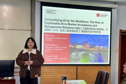 12月19日,柯力工商管理学术沙龙第105期在学院举行。澳大利亚麦考瑞大学商学院路英副教授应邀作题为“解读人工智能对劳动力的影响:可解释AI(xAI)在员工接受度和员工-管理者关系中的作用”学术报告。学院李绍龙、李昌骏、刘雅等多位老师及同学参加,涂乙冬教授主持。