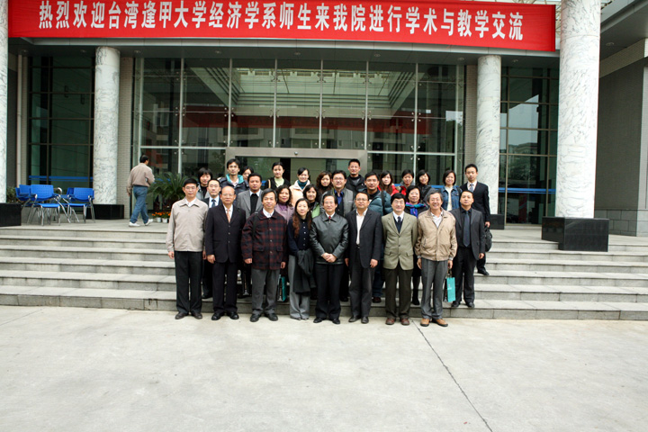 大楼前合影留念,然后逢甲大学师生在曾国安副院长和文建东主任、郭熙保主任的陪同下参观了经济发展研究中心、院图书分馆、实验中心、MBA与EMBA教室等处。