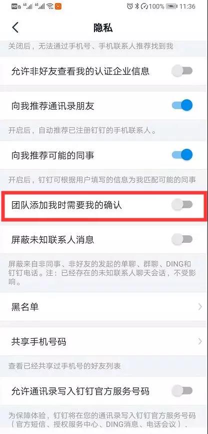 解决方法:登录钉钉APP,在“我的→设置→隐私→团队添加我时需要我的确认” 一栏,选择不勾选。