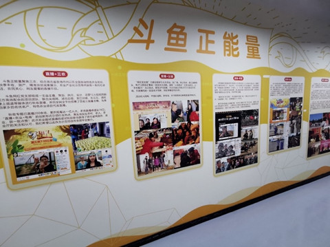 经过员工办公区,迎面而来的是斗鱼公司独具特色的文化宣传墙,文化墙展示了中国共产党的发展历史,也记录了斗鱼公司党建历程、红色文化建设以及丰富多彩的组织生活。曾老师介绍道,斗鱼在直播领域中率先创新性地成立起党支部,并且拥有众多优质的党员主播,除了在打造各类赛事和线下活动上游刃有余外,更是始终不忘正能量教育,获得了社会各界的好评。