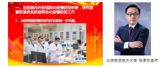 宋凌峰老师介绍了此次活动背景、流程与双方出席人员后,由北京航空航天大学张军欢老师带领大家集体学习《习近平总书记关于新冠肺炎疫情防控的重要讲话精神》,依据中共中央政治局4月17日的会议精神,从疫情防控和经济建设两个方面对系列重要讲话和新闻进行解读。