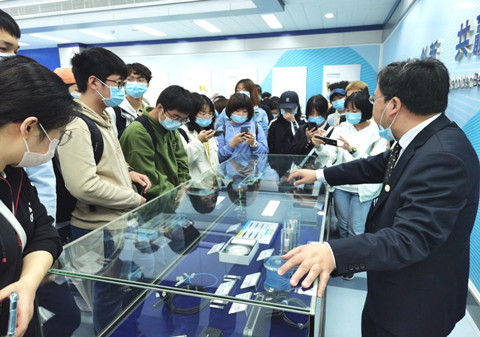 在对公司整体有一个大致的初步了解后,张书记带领师生们来到产品展柜,向大家介绍公司的产品。长飞公司主要生产和销售通信行业广泛采用的各种标准规格的光纤预制棒、光纤、光缆,基于客户需求的各类特种光纤、光缆,以及射频同轴电缆、配件等产品,公司拥有完备的集成系统、工程设计服务与解决方案,为世界通信行业及其他行业(包括公用事业、运输、石油化工、医疗等)提供各种光纤光缆产品及综合解决方案,在全球70多个国家和地区提供优质的产品与服务。