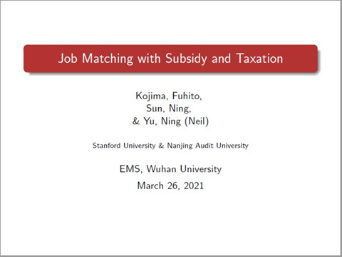 2021年3月26日上午9点30分,珞珈经管高端论坛第二十八期在学院B129教室如期举行。本次论坛邀请南京审计大学孙宁教授进行了主题为“Job Matching with Subsidy and Taxation”的学术讲座,由管理科学与工程系王先甲教授主持,校内外约50余位师生参加本次学术论坛。