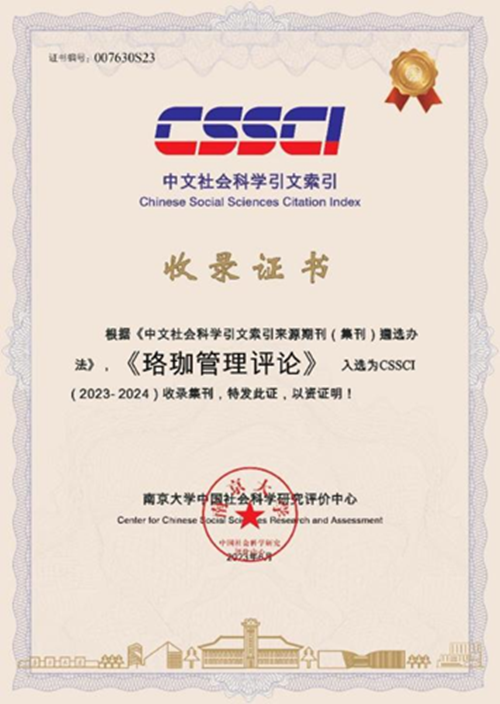 2023年夏,南京大学中国社会科学评价中心发布期刊评价成果,《珞珈管理评论》入选《中文社会科学引文索引(2023-2024年)来源集刊目录》(CSSCI)。