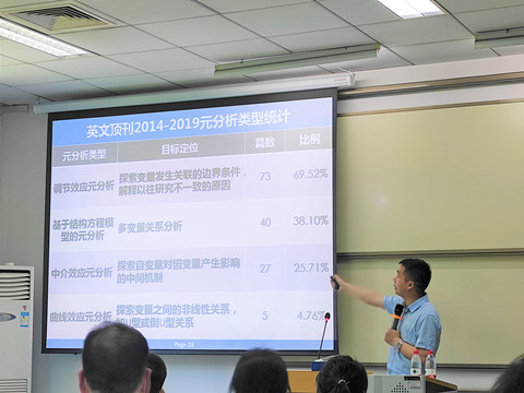“元分析的混合效应模型是组织管理研究中尚未涉足的领域”,卫教授在讲解过程中强调,他鼓励在场的老师与学生重视元分析的应用,向这块待探索的领域发起挑战。