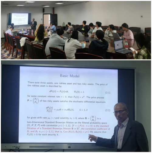 金融系主办的珞珈经管发展论坛第八十四期在学院顺利举行。中国人民大学张顺明教授做了题为“Limited Participation Equilibrium Pricing under Ambiguity of Correlation: The Continuous-Time Case”的学术报告,本次会议由金融系罗琦老师主持,熊和平、林乾等学院多位老师和同学参加了此次论坛。