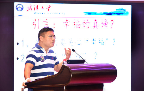 严瑜老师从“为什么要关心幸福”、“ 什么是幸福”、“什么因素决定了我们是否幸福”、“如何实现幸福”四个层次阐释了“幸福的真谛”。他从“对幸福的追求是人类永恒的话题,人类的文明史就是对幸福的追逐史”开篇,讲述了幸福概念的一些“刻板印象”,引导教职工思考“幸福是稍纵即逝的状态还是稳定的特质?”而后,他讲解了埃德·迪纳的幸福观:主观幸福感由情感(感觉)和认知(知觉)两方面构成;幸福的悖论从横断研究来看,收入和幸福感正相关,从纵向研究来看,收入和幸福感无关;此外,爱、金钱对主观幸福感也有着一定的相关度。而卡洛尔·韦夫则认为心理幸福是一种稳定的心理品质,在心理幸福的6个维度中生活目的和良好的关系是促进心理健康最重要的指标。