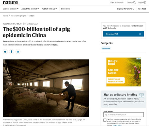 游士兵教授于2021年9月27日在《自然·食品》(nature food)在线发表的论文《African swine fever outbreaks in China led to gross domestic product and economic losses》,被《自然》(Nature)杂志遴选为Research Highlights论文,进行了专题介绍、评述和关注。
