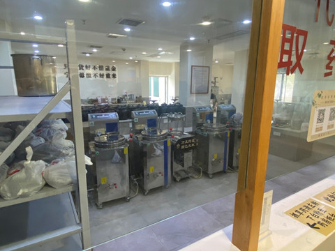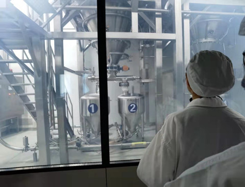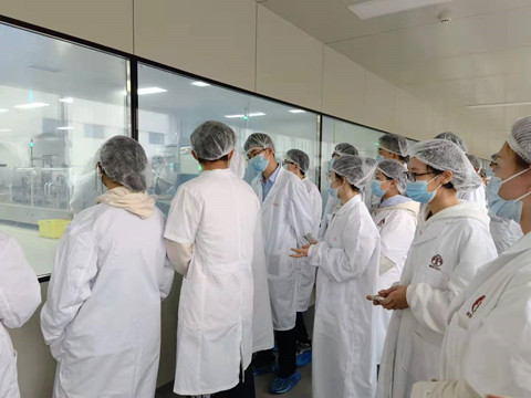 接着,在讲解员的带领下,同学们怀着激动的心情来到了龙牡壮骨颗粒的生产车间。同学们在外厅更换参观服,戴好防尘帽鞋套后,排队进入了工作间。隔着透明的玻璃,同学们看到称量好的药材被有序地投入流水线进行研磨处理,通过管道送到相应的压力罐里,经过煮沸后烘干好的药品粉末被送入药品振动筛进行筛选。经过种种工序后,装盒后的药品呈现在了同学们的面前。据讲解员介绍,该车间粉尘控制十分好,几乎达到了一尘不染的程度。智能且高效的生产车间为叶开泰的持续向上发展提供了坚实的生产基础。