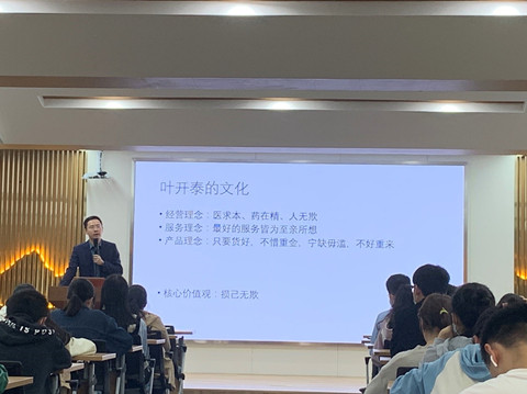 最后,全体同学来到当归中药馆,聆听叶开泰总经理陈蒙蒙带来的精彩演讲。 讲座聚焦于文化、服务、营销和叶开泰自身的战略部署、产业定位,深入浅出地向同学们介绍了企业的健康发展所必备的举措。在自由探讨环节,同学们积极发言,提出了“在信息时代,优质产品能否大众化?”“产品代销和投放广告各有何利弊?”等富有创造性的问题,陈总经理对同学们的提问做出了生动且深入的回答。