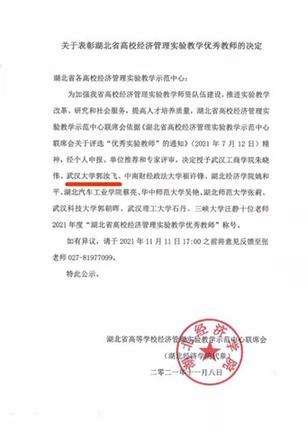 郭汝飞副教授荣获“2021年度湖北省高校经济管理实验教学优秀教师”荣誉称号。