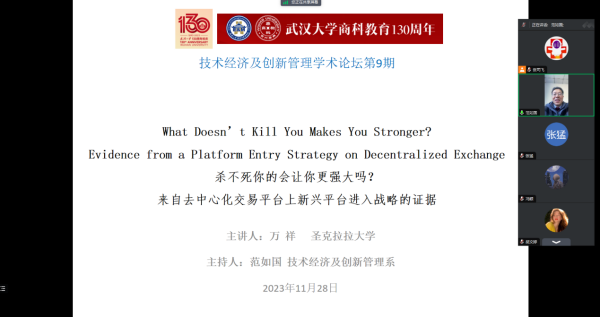 技术经济及创新管理系于11月28日上午举办技术经济及创新管理学术论坛第9期,特邀美国圣克拉拉大学万祥老师举办学术讲座,讲座主题为“What Doesn’t Kill You Makes You Stronger? Evidence from a Platform Entry Strategy on Decentralized Exchange”。论坛由范如国教授主持。