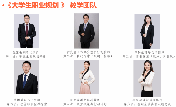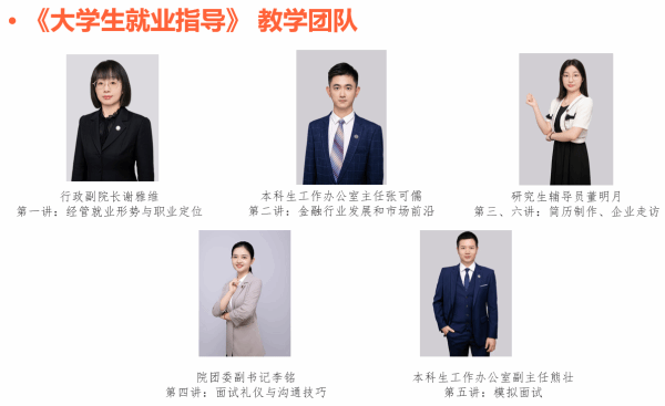 学院高度重视就业指导工作的队伍专业化建设,积极选派资助辅导员开展各类职业生涯教育培训,提升辅导员专业化技能,为学生提供专业化就业指导建议。在就业课程中,学院辅导员齐上阵,组成高质量授课团队,发挥专业特长,为同学们带来精彩纷呈的职业辅导课程。