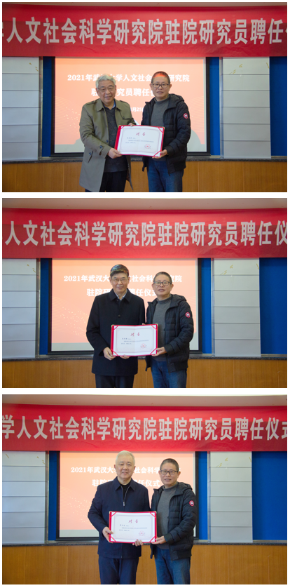 人文社会科学研究院第三届、第四届驻院研究员聘任仪式。第三届、第四届驻院研究员遴选工作分别于2019年12月、2021年1月启动,经单位推荐、资格审核与评审、结果公示、学校审定,聘任乔洪武、陈继勇、郭熙保、王先甲、肖希明、谭力文等六位教授为海棠书屋