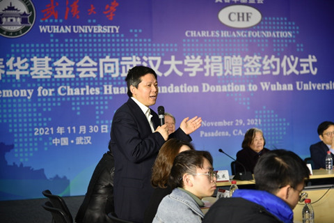 首先院党委书记杜晓成致辞。“事业成功的企业家很多,但是成功后饮水思源的企业家却不多。”杜晓成高度评价黄春华校友不仅有令人惊叹的投资天分,还有令人钦佩的反哺母校情怀。黄春华校友在决定捐赠母校时,最初计划捐赠3000万美元用于学校发展,后来在和学院视频连线中,了解到学院发展现状和美好前景时,欣然决定追加1000万美元用于学院人才引进。杜晓成对黄春华校友的慷慨捐赠表示衷心感谢,这份对母院的厚重情谊令所有人动容。