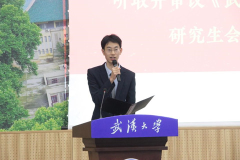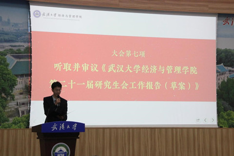 学院第二十一届研究生会执行主席邓龙真同学向大会作《矢志奋斗凝聚青春力量 勇担使命谱写精彩华章》为题的工作报告,对本届研究生会工作进行了回顾和总结,并代表第二十一届研究生会对未来工作提出建议。