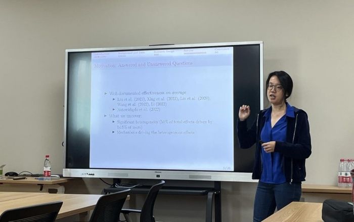首先,陈滢老师介绍了研究的背景和动机。在2022年,北京市政府为了促进消费,联合多家互联网平台以先到先得的方式向居民发放了电子消费券。随后,陈滢老师详细介绍了研究的数据和模型设定。通过与“饿了吗”平台合作获得了发放消费券前后两周的用户订单的面板数据,并将参与并获得消费券的用户作为处理组,将参与但未获得消费券的用户作为对照组,构建了双重差分模型进行估计。