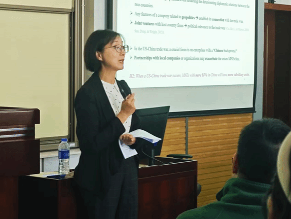 3月29日上午,珞珈经管创新论坛第89期在学院成功举行。本次论坛邀请了香港城市大学管理系吕文珍讲席教授进行学术报告,题目为“事件空间与跨国公司的国际介入:中美贸易战期间日本在华跨国公司的表现(Event Space and MNEs’ International Involvement: Japanese MNEs in China During the US-China Trade War)”。学院副院长黄敏学教授主持了本次论坛,工商管理系主任陈立敏教授以及刘学元教授、江诗松副教授、雷昊老师及部分硕士、博士研究生等参会。