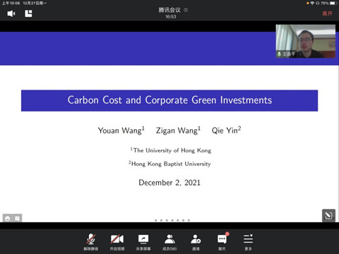 金融发展与政策研究中心共同主办的“景林珞珈金融论坛第215期”在腾讯会议平台通过线上方式举行。本次讲座由金融系余静文老师主持,香港大学的王自干老师带来主题为“碳税和企业绿色投资”的学术报告,一百余名校内外师生参加了此次线上讲座。