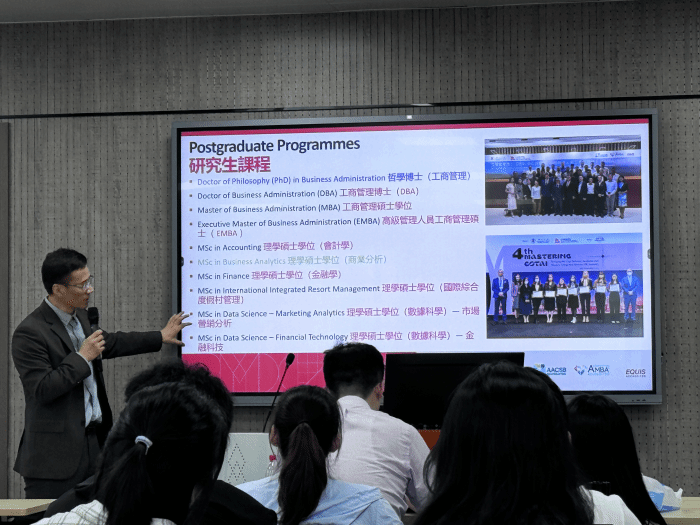 会谈后,舒连杰教授面向相关本科生和硕士生进行澳门大学工商管理学院硕博项目的宣讲,同学们对澳门人才引进政策、优秀大学生夏令营、项目申请具体要求等感兴趣的问题进行交流。