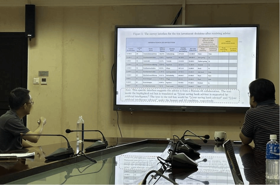 7月2日上午,珞珈经管创新论坛第101期在学院419举行。本次论坛邀请法国巴黎高等商学院 (HEC Paris) 信息系统的李喜彤教授作题为“My Advisor, Her AI and Me: Evidence from a Field Experiment on Human-AI Collaboration and Investment Decisions” (我的导师、她的人工智能和我:人类与人工智能协作和投资决策的实地实验证据)的学术报告。学院高宝俊、杨永歌等老师及学生参加,论坛由高宝俊教授主持。