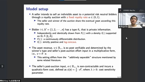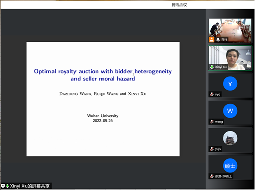 5月26日下午,经济学高级研究论坛第185期在线举行。本次讲座由数理经济与数理金融系韩立宁老师主持,邀请中山大学徐欣毅老师带来主题为“Optimal royalty auction with bidder heterogeneity and seller moral hazard”的学术报告。海棠书屋