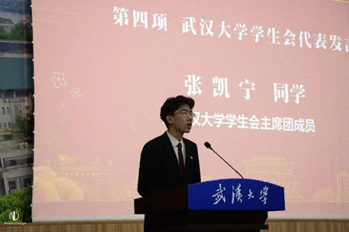 校学生会主席团成员张凯宁发言。他从思想引领、权益维护等方面对过去一年学院的学生工作表示了肯定,并提出学生会要提高改革攻坚能力,增强组织力,勉励学院学生会再接再厉。